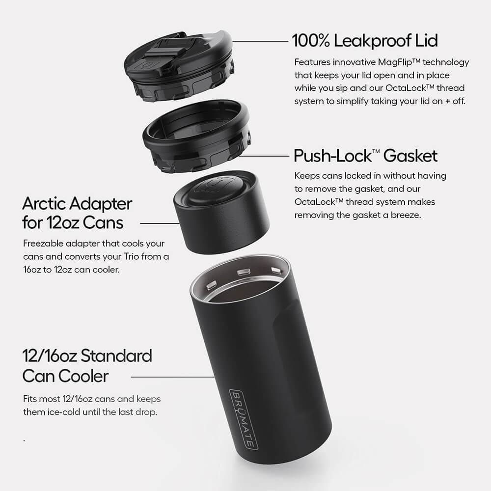 Hate warm beer? We do too. That's why we created the Hopsulator Trio, the most versatile can-cooler in the world. It fits all your favorite canned beers and sodas, comes with a freezable adapter for 12oz cans, and with one quick switch of the lid, turns into a 16oz pint glass. The Hopsulator Trio includes BevLock™ technology, offering a fully leak-proof locking lid and magnetic closure to keep the lid open while you sip.