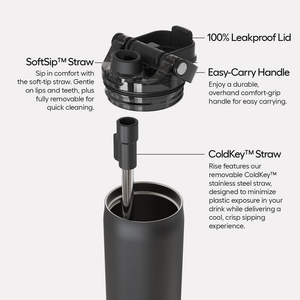 Rise is your new go-to for everyday hydration. The leakproof MagFlip™ lid locks in every sip, BevGuard™ insulation keeps drinks cold, and the covered straw protects your bottle on the go. Sip with the ColdKey™ metal straw so plastic isn’t sitting in your water all day, or remove it to chug from the covered SoftSip™straw - your choice.