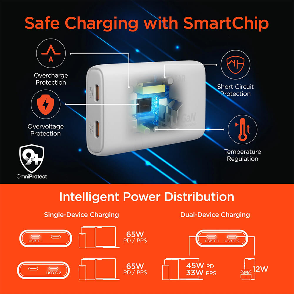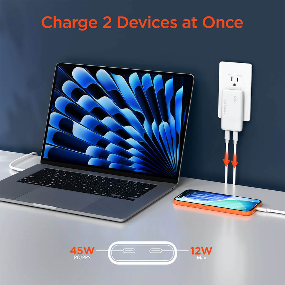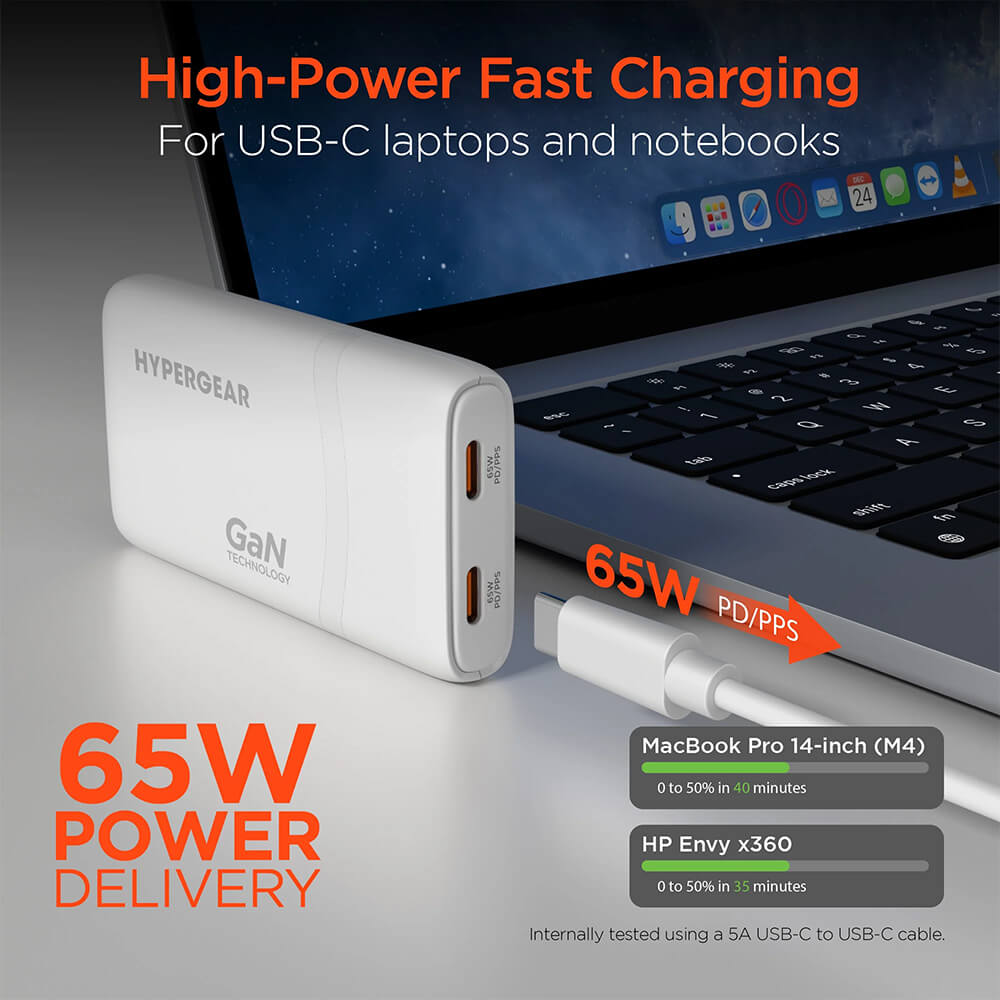 HyperGear SpeedBoost 65W Dual USB-C PD Ultra-Slim GaN Laptop Charger with PPS