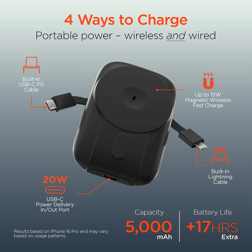 Hypergear 5,000mAh Mag Grip Go Magnetic Wireless Fast Charge Power Bank with Built-In Cables