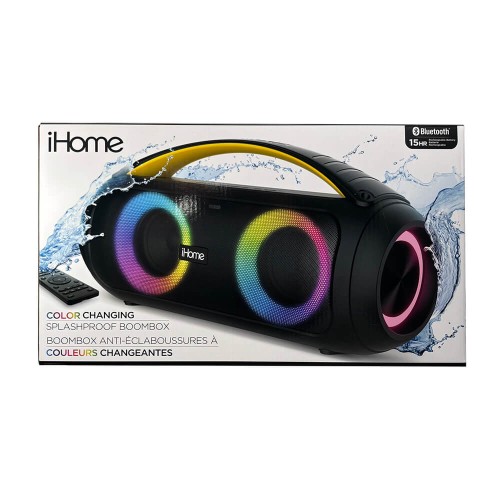 Get ready to party with the iHome Color Changing Splash-Proof Boombox. Connect this wireless speaker via Bluetooth and stream audio from up to 100 feet. Scan your favorite FM radio stations, or connect via USB, aux-in, or TF card to enjoy audio from your personal collection. Keep the party going after dark when you choose from 10 color changing light modes, and use the included multi-function remote to adjust volume, navigate tracks, set FM radio presets, and more. Plus, plug in a microphone (not included) and record an amazing karaoke performance with family or friends (USB drive or TF card required).