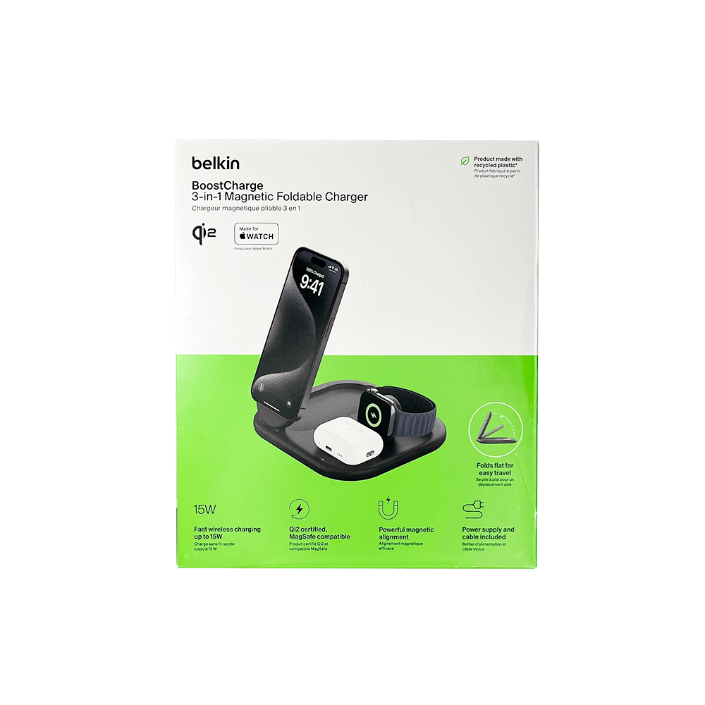 Charge your essentials with an ultra-convenient foldable stand. It delivers 15W of fast wireless charging to your iPhone 16/15/14/13/12, 5W to your Apple Watch and 5W to your AirPods. Leveraging MagSafe compatibility and Qi2 technology, you can place your iPhone on the charging pad for a secure, magnetic connection.