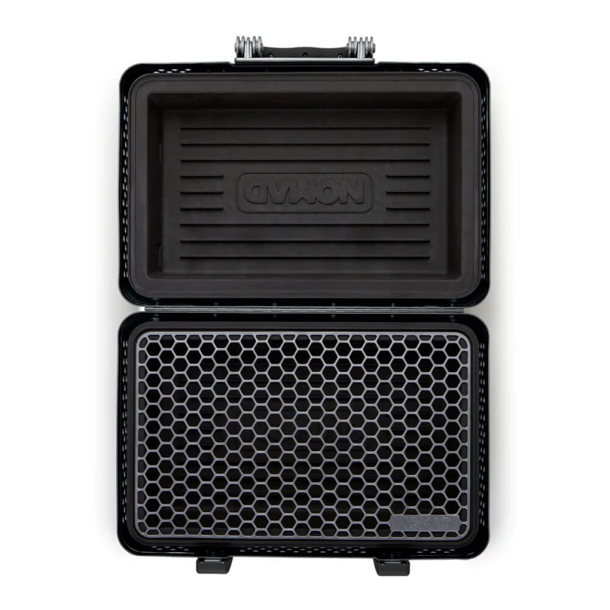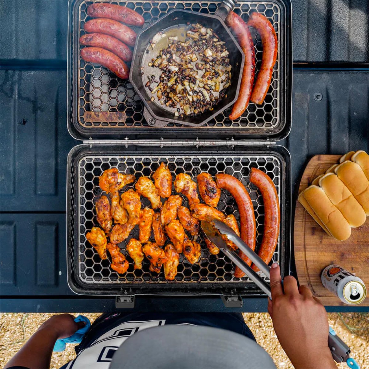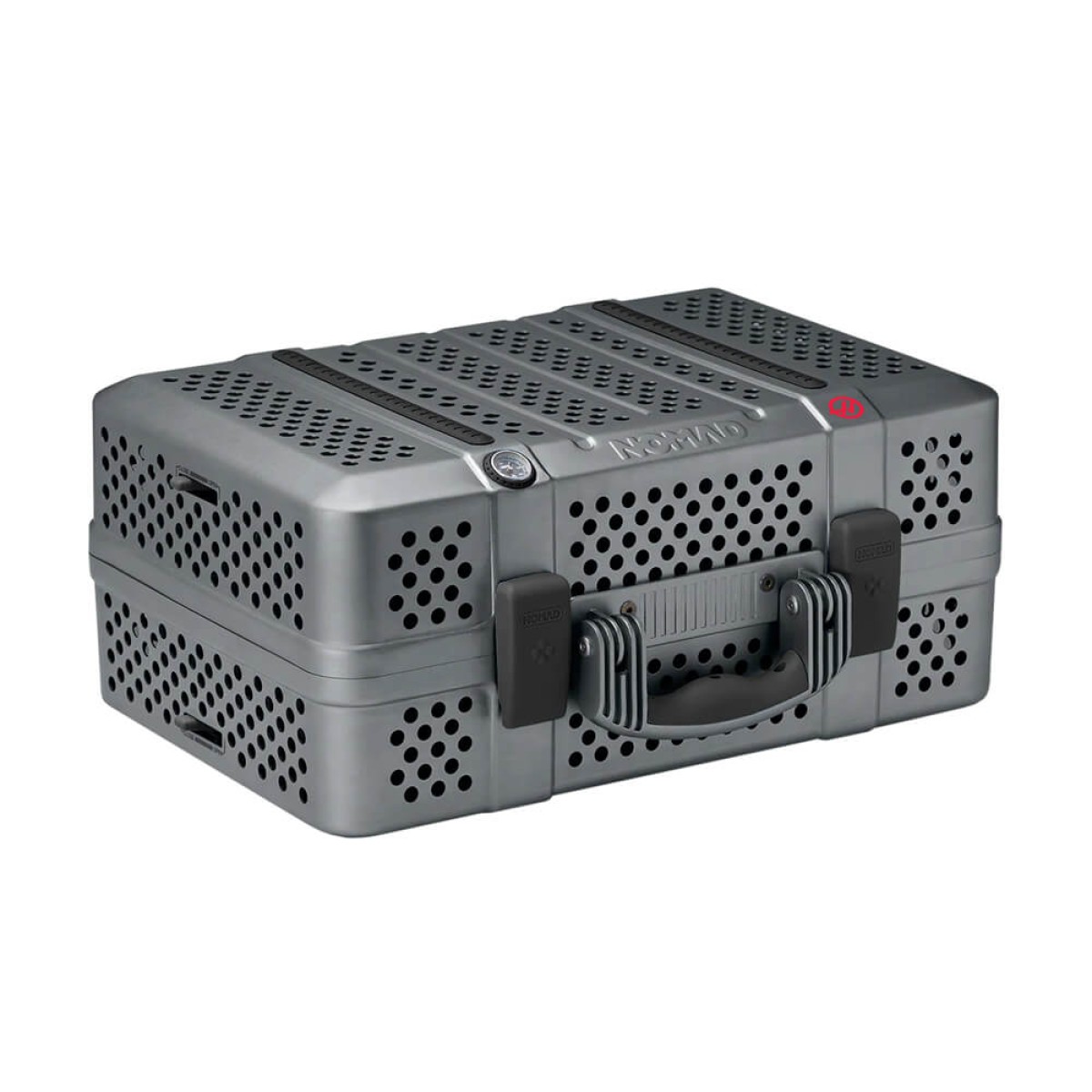 A premium-quality charcoal barbecue grill & smoker with unparalleled portability. Now with twice the ventilation, this 28-pound carrying case houses two heavy-duty, diecast cookboxes and delivers up to 425 square inches of grilling space. NOMAD packs a punch in the durability department with interior cast aluminum construction.